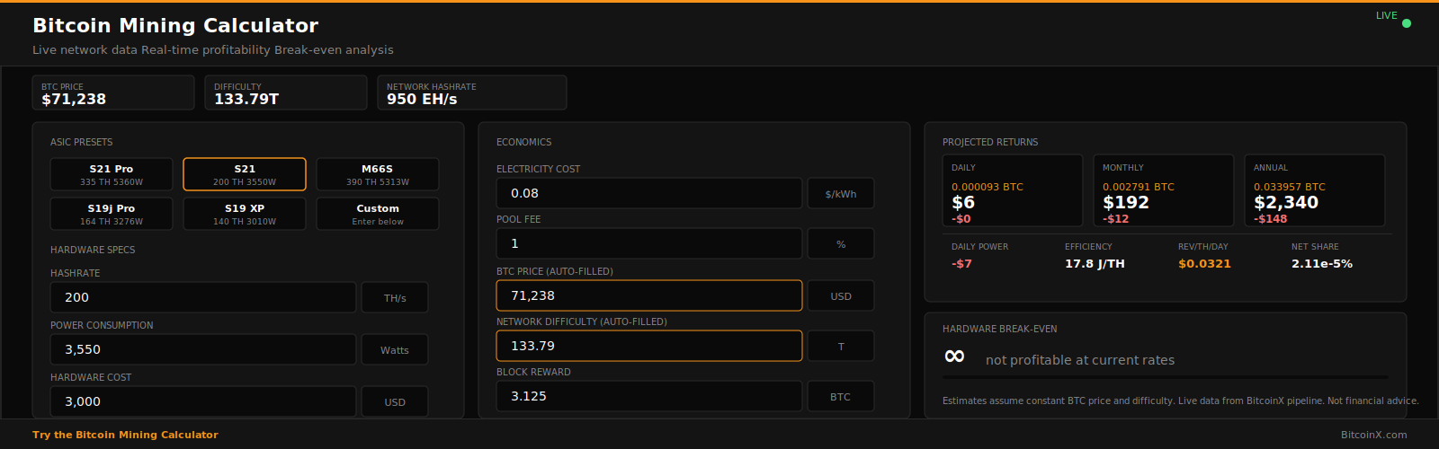 BitcoinX has tracked Bitcoin since the early days. We’ve rebuilt our platform around one idea: the best Bitcoin decisions come from real data, not hype. Every chart, every calculator, and every signal on this site is powered by a live data pipeline updated daily — pulling from the blockchain, global markets, and 10 years of price history.