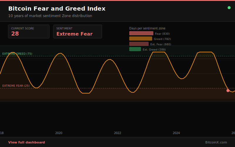 Bitcoin is currently trading at $68,910, sitting 20% below its 200-day moving average of $110,483. The Fear & Greed Index reads 28 — Extreme Fear — historically one of the better times to accumulate. The MA50 remains above the MA200, meaning a technical death cross has not yet occurred despite the price weakness.